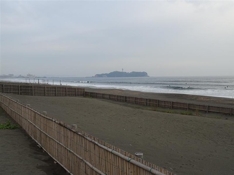 自宅を出発し国道134号線を少し走って、引地川河口付近の歩道橋から江ノ島です。